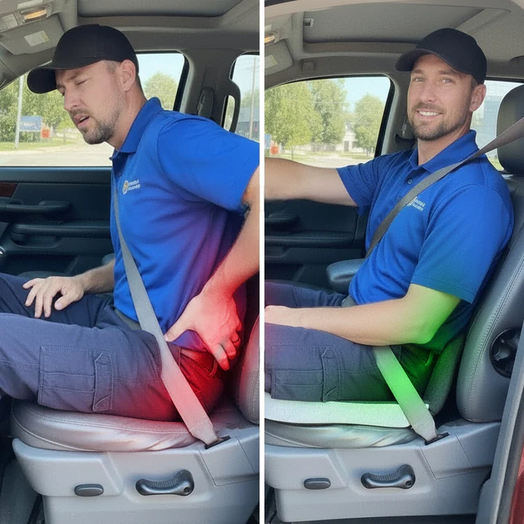 Car seats and office chairs are built for durability, not your body. Their shape forces your hips to sag, your thighs into the seat, and circulation slows, leaving your legs restless and your back aching long after you stand up.